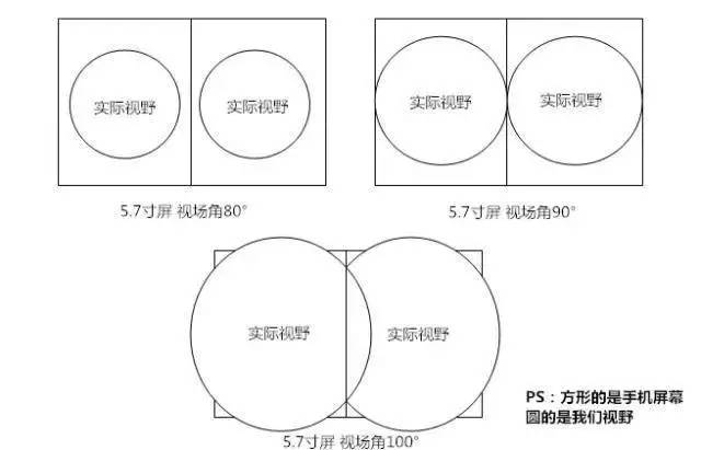 那么我们如何获得最好的体验呢?首先从上表我们可以看出,某些品牌宣传的自己的设备拥有大视场角对于拿着小屏用户来说根本没有任何卵用,带上VR眼镜发现能看到自己的手机边框,这效果简直上天,还去谈什么体验和沉浸感。再看下面的图片: