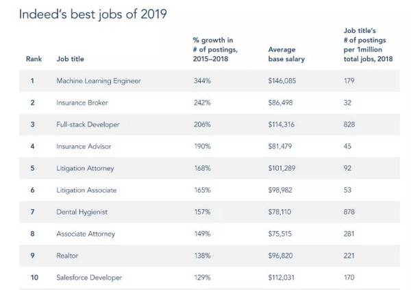 全球知名招聘求职网站Indeed,最近发布了2019年度最佳工作榜单,公布了2019年的行业领域及工作岗位薪酬。