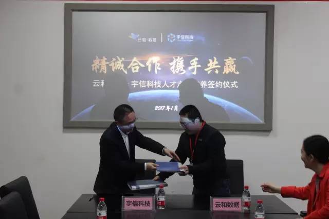 2017年1月16日上午,云和数据旗下高端泛IT教育品牌——云和教育与北京宇信科技集团股份有限公司(以下简称宇信科技)成功签订了“人才定制培养”合作协议。宇信科技郑州基地总负责人夏玉刚和云和数据王总共同出席了此次签约仪式。