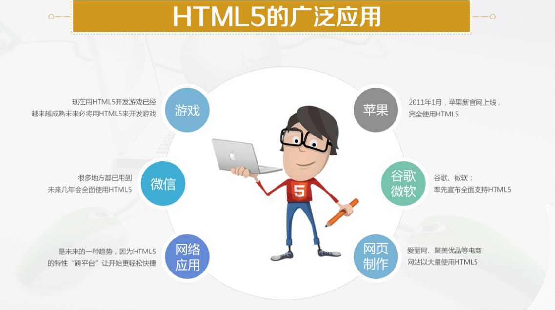 HTML5是近十年来Web开发标准最巨大的飞跃,是最新一代的Web语言,它的新使命是将Web带入一个成熟的应用平台。从招聘网站分析,Web前端用人数量已经远远超过主流编程语言Java、ASP、和iOS等的开发人员的数量。随着谷歌、YouTube、Twitch等大型企业纷纷将视线转投向HTML5,更加确认了HTML5在互联网时代的发展远景。