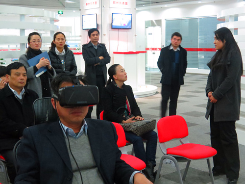 在参观环节的虚拟现实技术体验区,胡书记一行听取了云和Unity3D虚拟现实技术报告和公司基于该项技术在房地产、文化旅游和数字城市等行业领域所取得的成绩和突破,并亲身体验了公司基于房地产领域开发的虚拟现实体验项目。